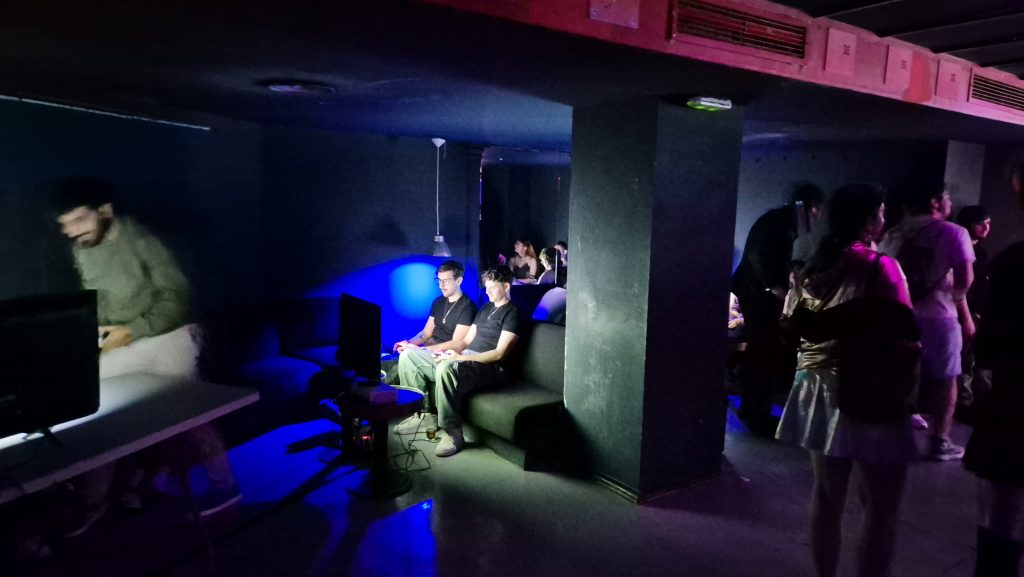 El escenario central es un hervidero de energía. Dos DJs abren la noche mezclando temas electrónicos con samples de videojuegos. El público responde con entusiasmo: baila, salta, canta, mientras al fondo una pantalla gigante proyecta visuales, gameplays alterados y fragmentos de intros. En una esquina, una pequeña televisión colgada replica lo mismo.