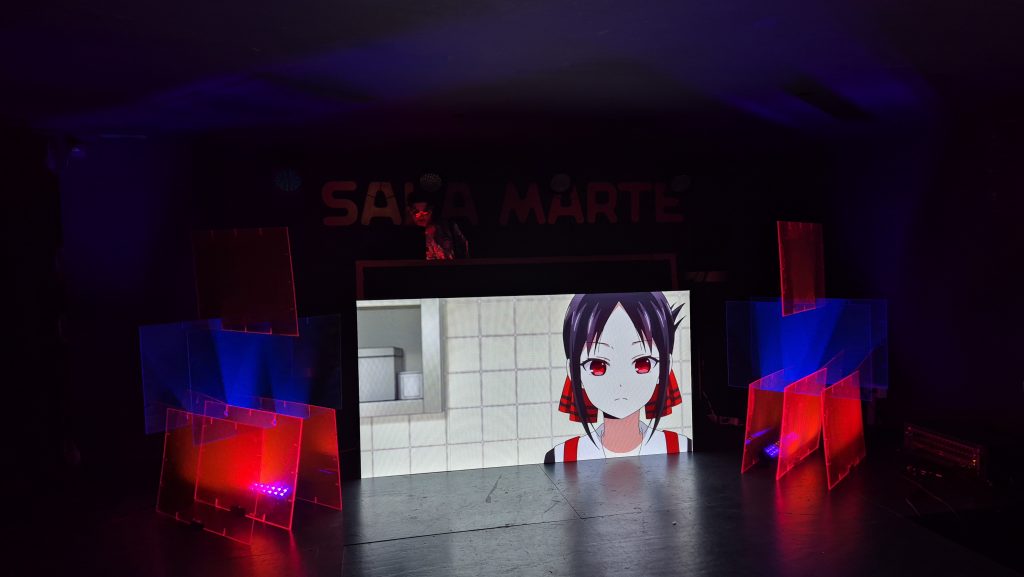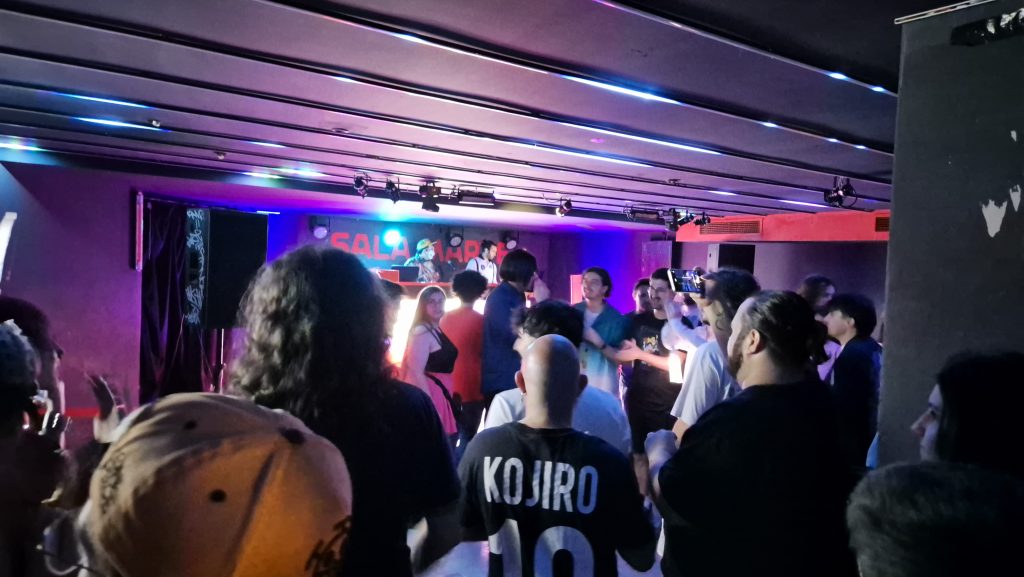 El momento clave llega a la 1:00. Las luces bajan, la música cambia y empiezan los openings de animes. En una hoja de papel, junto a la cabina del DJ, el público puede apuntar a mano los títulos que quieren escuchar: «Shin-Chan», «Evangelion», «Chainsaw Man». Uno tras otro, los hits explotan por los altavoces, coreados por toda la gente. Hay euforia, brazos en alto y móviles grabando. Es una misa otaku donde los himnos son animaciones.